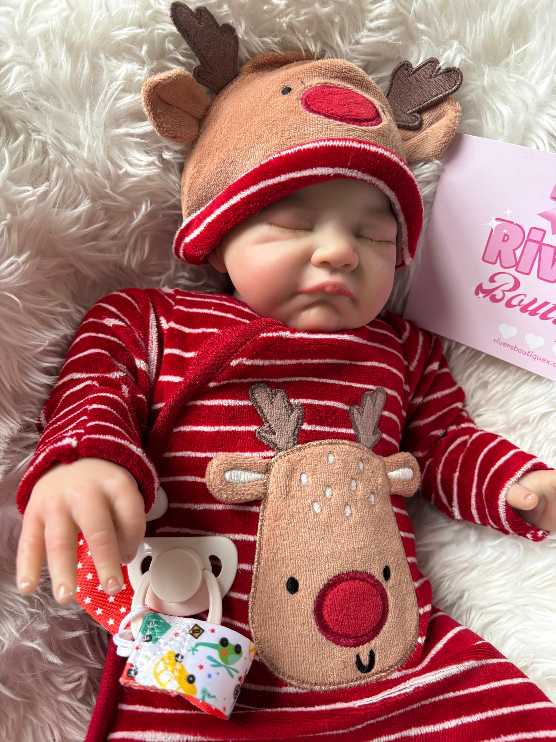 Stunning baby boy reborn. He has a soft body with silicone vinyl arms, legs and head. He is 19 inches and weighted at 5.6lbs.