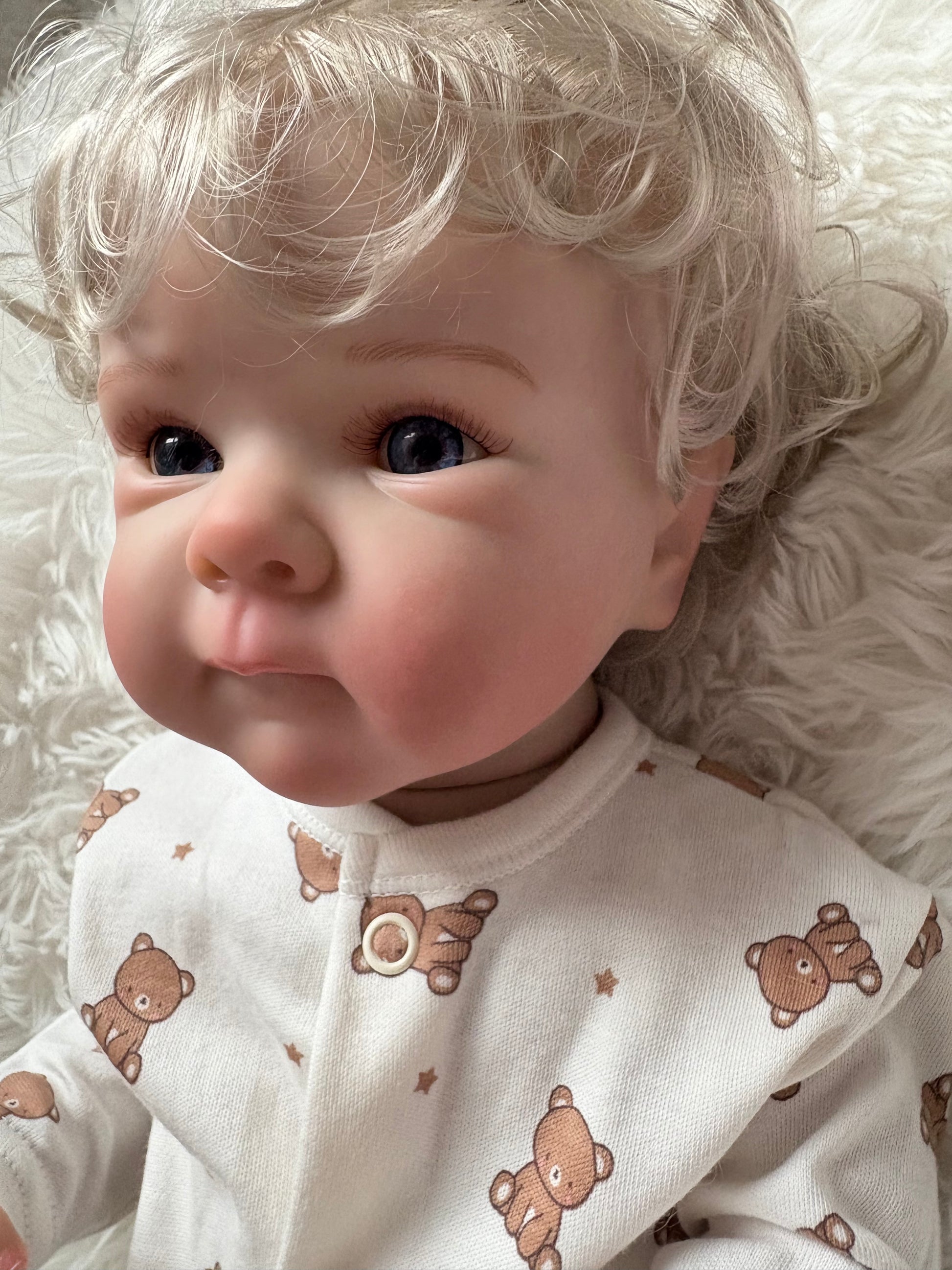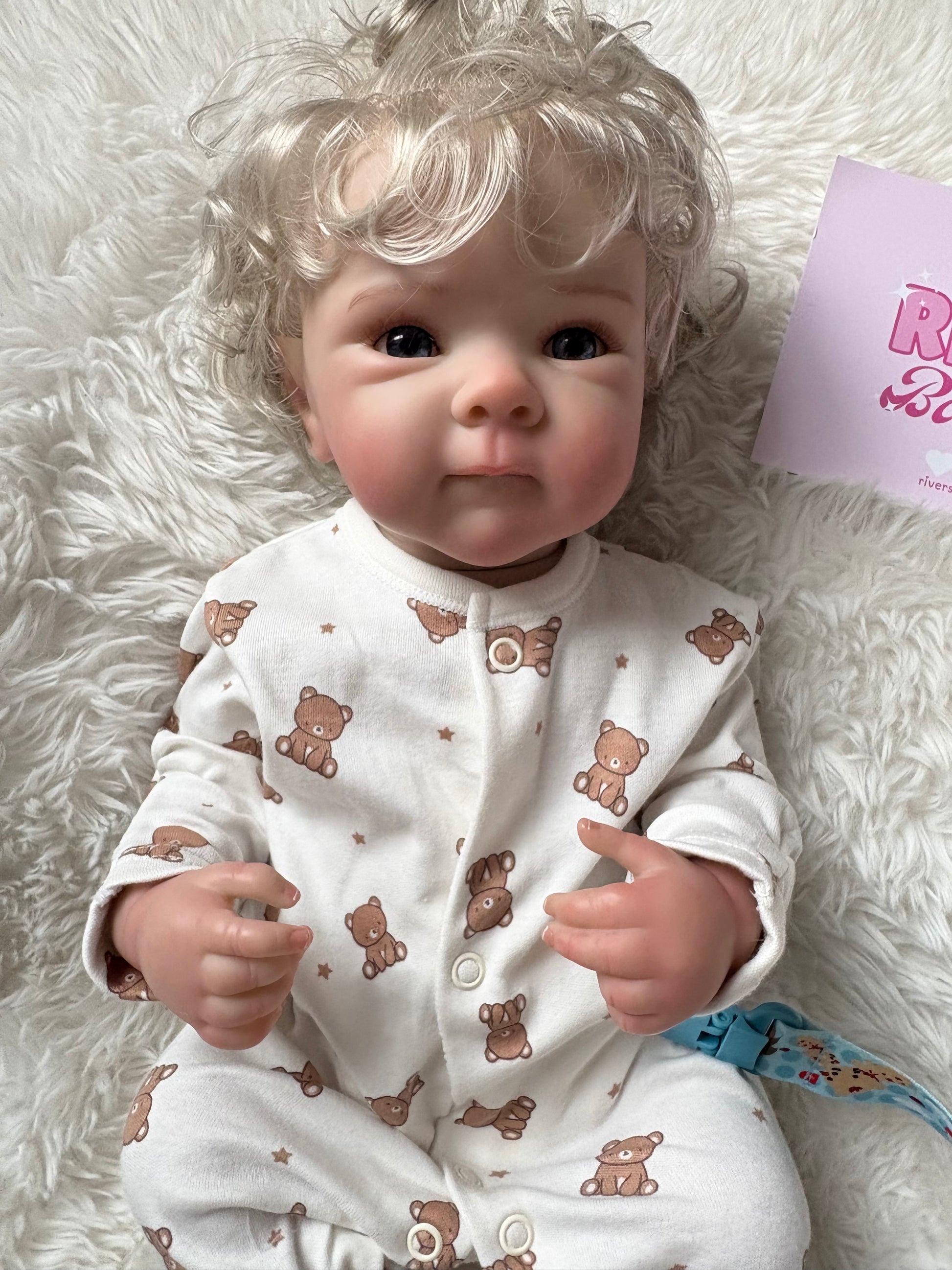Beautiful baby boy reborn with full body detail (boy) and rooted blonde hair! He is 50cm and not weighted. He can be bathed and looked after like a real baby. His body is detailed and made from soft silicone vinyl. He comes with outfit as per picture, magnetic dummy, dummy clip, bottle, birth certificate and spare nappy.