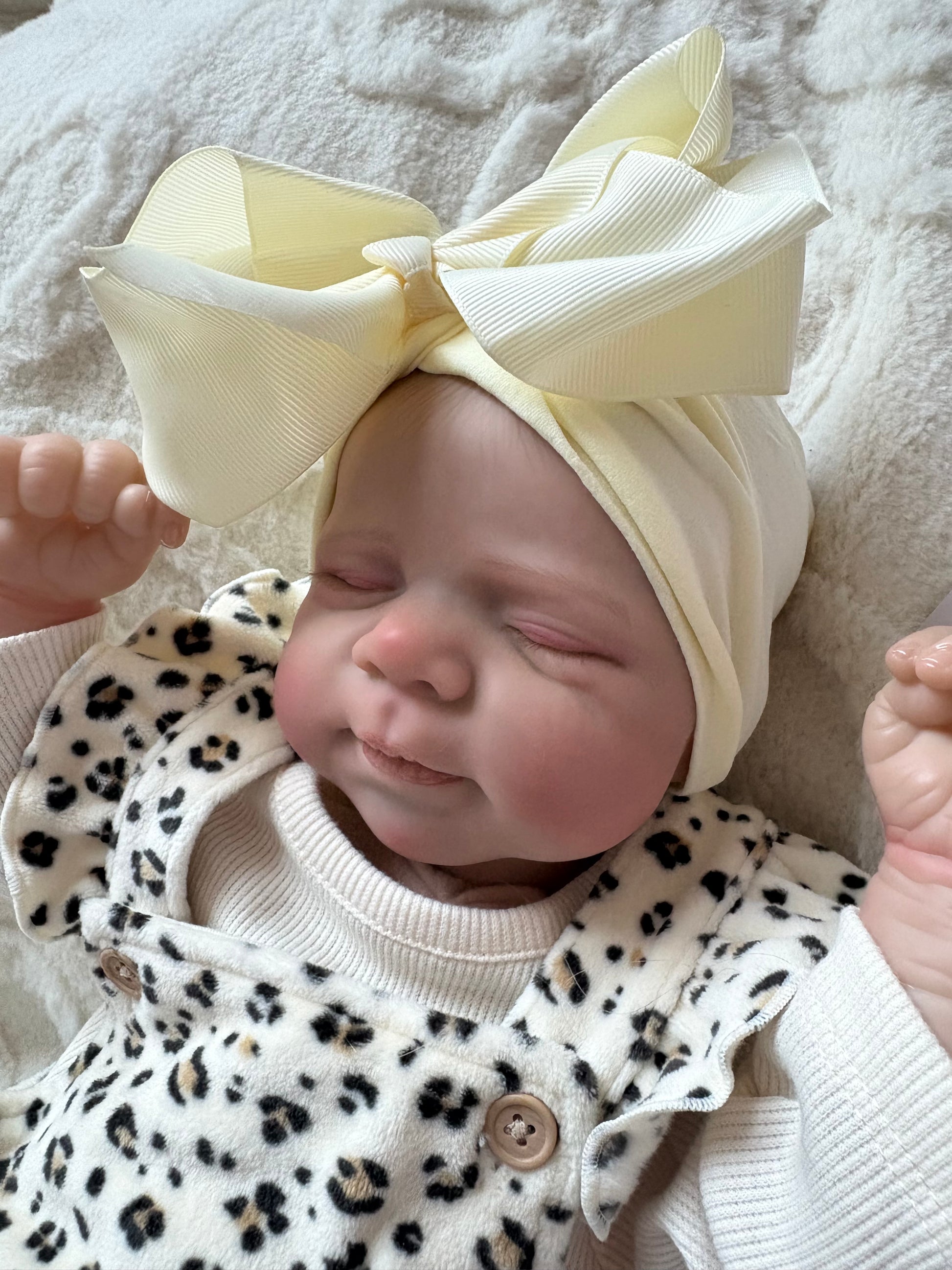 Stunning baby girl reborn. She has a soft body with silicone vinyl arms, legs and head. She is 20 inches and weighted at 4.4lbs.