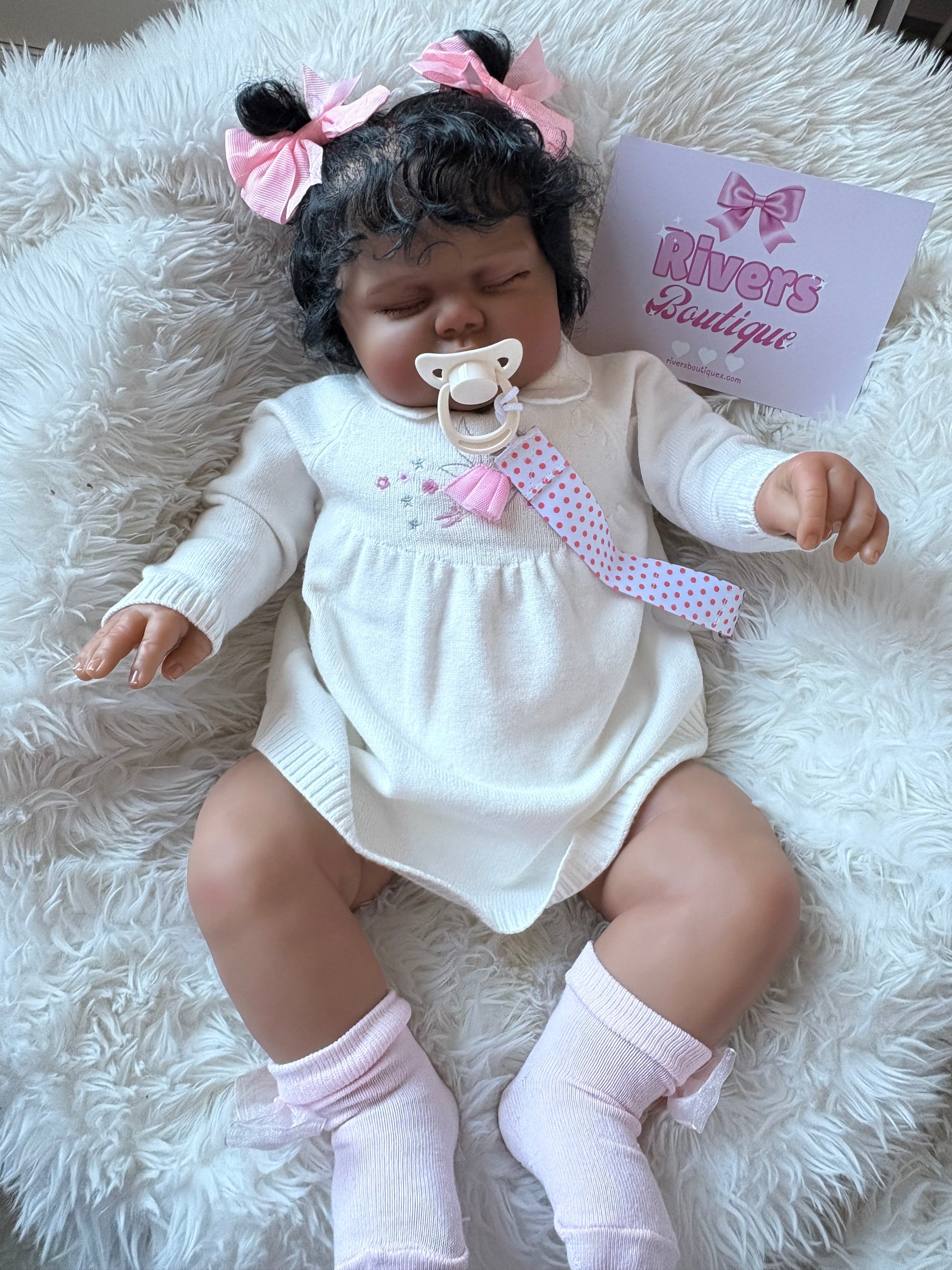 Stunning toddler girl reborn. She has a soft body with silicone vinyl arms, legs and head. She is 24 inches and weighted at 7.4lbs.